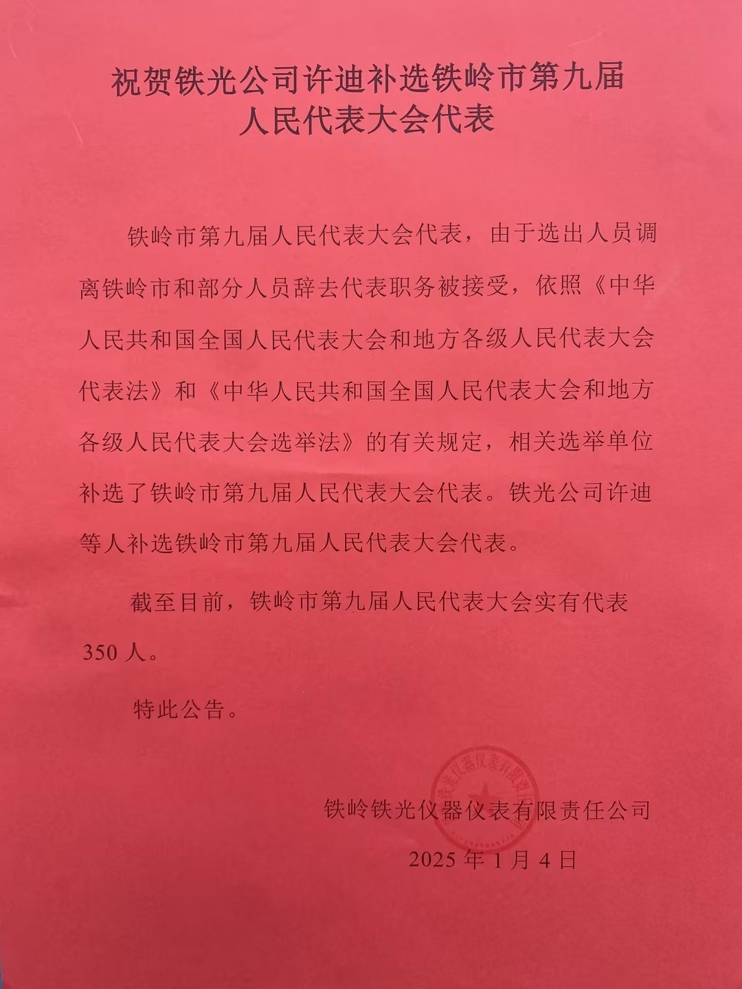 祝贺铁光公司许迪补选铁岭市第九届 人民代表大会代表